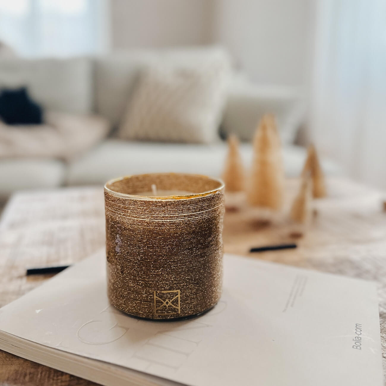 Coulée dans un verre doré à l’effet patiné, cette bougie de 500 g de cire végétale 𝗼𝗳𝗳𝗿𝗲 𝘂𝗻𝗲 𝗽𝗿𝗲́𝘀𝗲𝗻𝗰𝗲 𝗴𝗲́𝗻𝗲́𝗿𝗲𝘂𝘀𝗲 𝗲𝘁 𝗹𝘂𝗺𝗶𝗻𝗲𝘂𝘀𝗲. Une pièce forte, pensée pour accompagner les longues soirées d’hiver, 𝗹𝗲𝘀 𝗺𝗼𝗺𝗲𝗻𝘁𝘀 𝗽𝗮𝗿𝘁𝗮𝗴𝗲́𝘀 ou les instants suspendus.